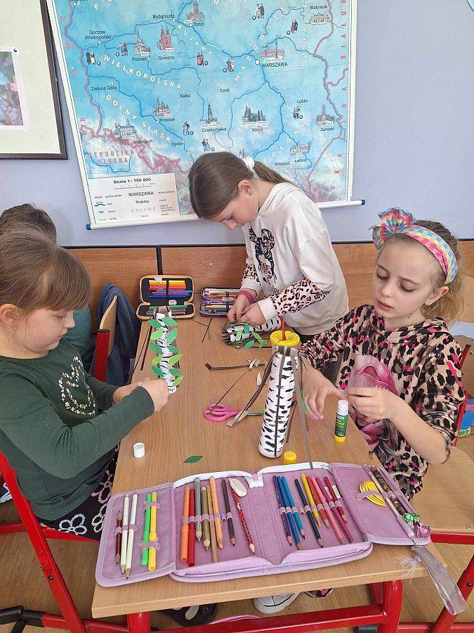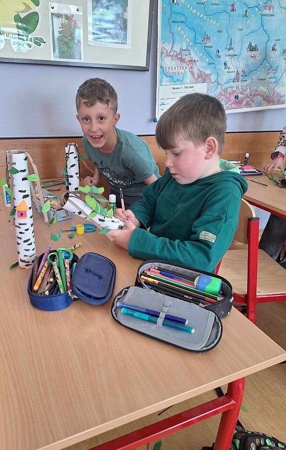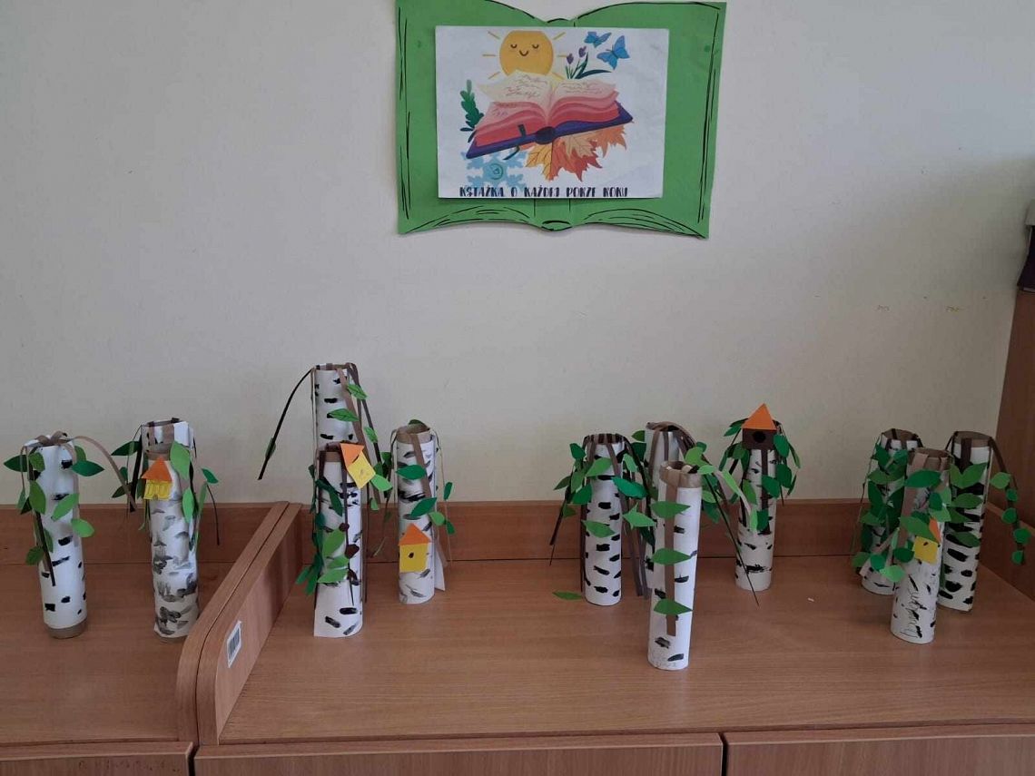 Po lekturze rozmawialiśmy o oznakach wiosny, które już zaczynają pojawiać się wokół nas. Następnie dzieci przystąpiły do twórczego działania — z papierowych rurek wykonały piękne wiosenne drzewka, brzozy, które wyglądały naprawdę efektownie! Brawo pierwszaki!