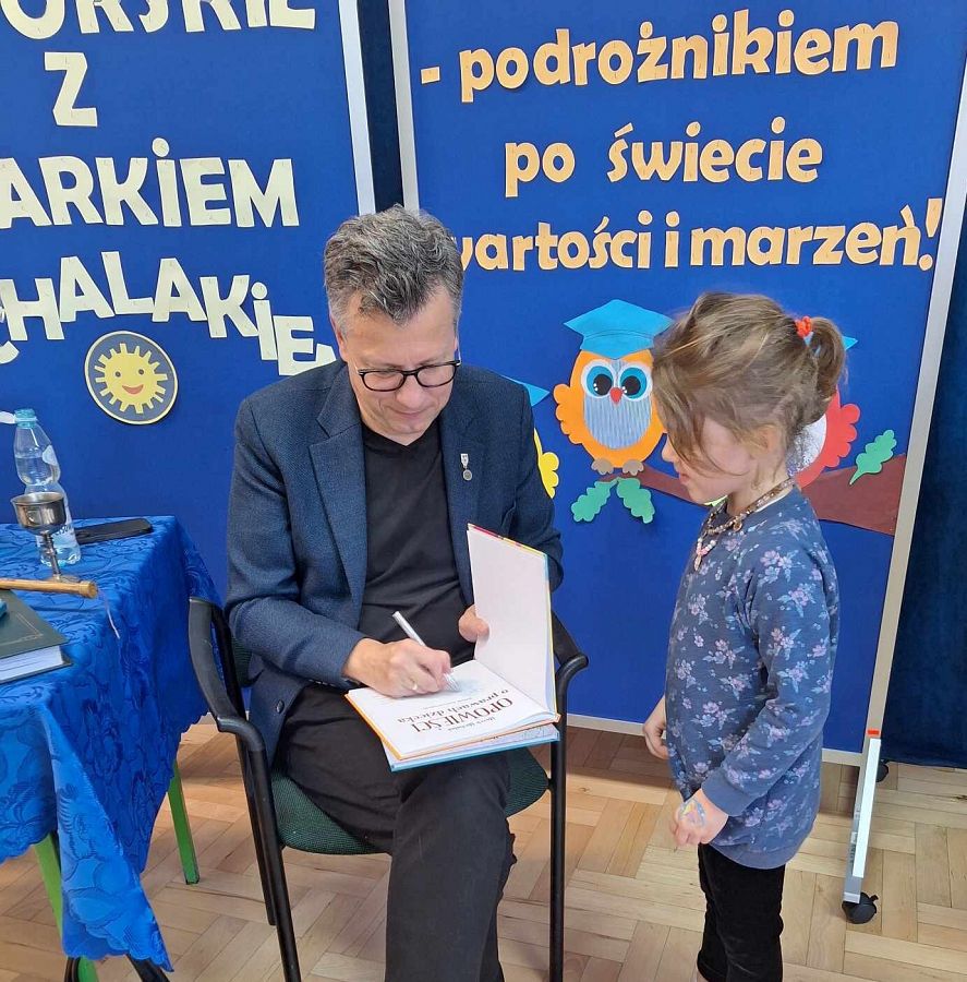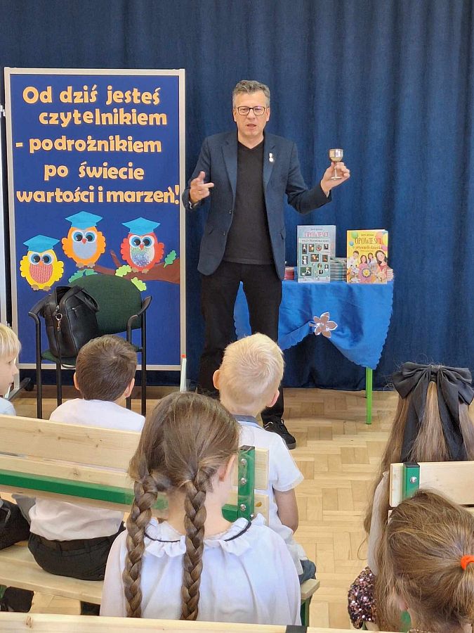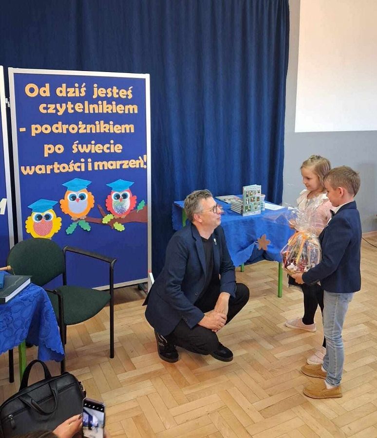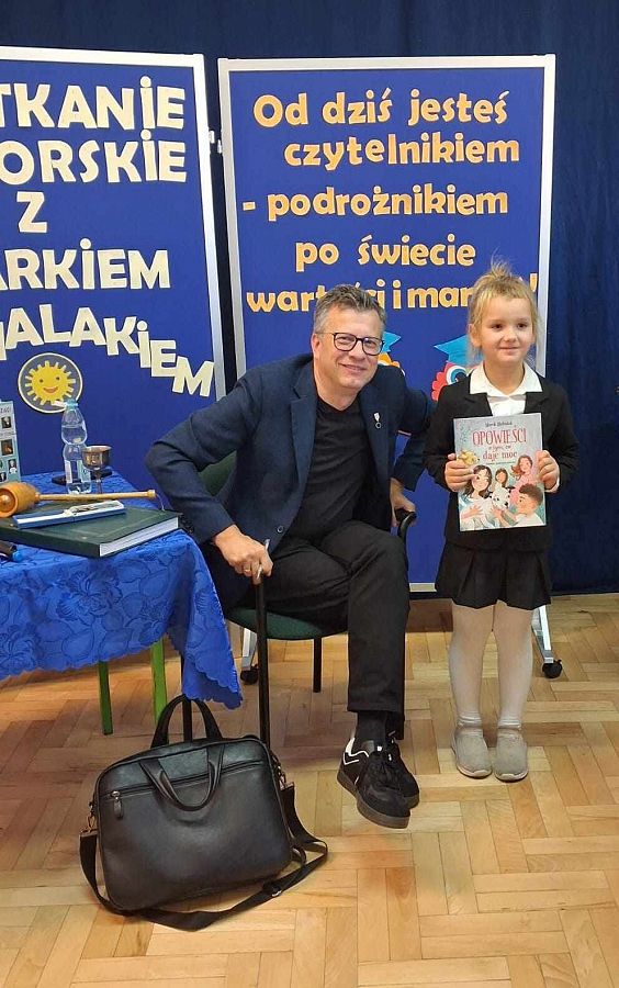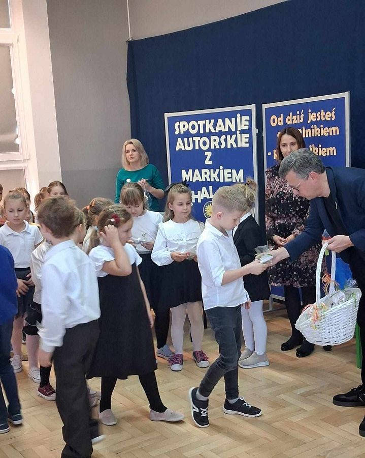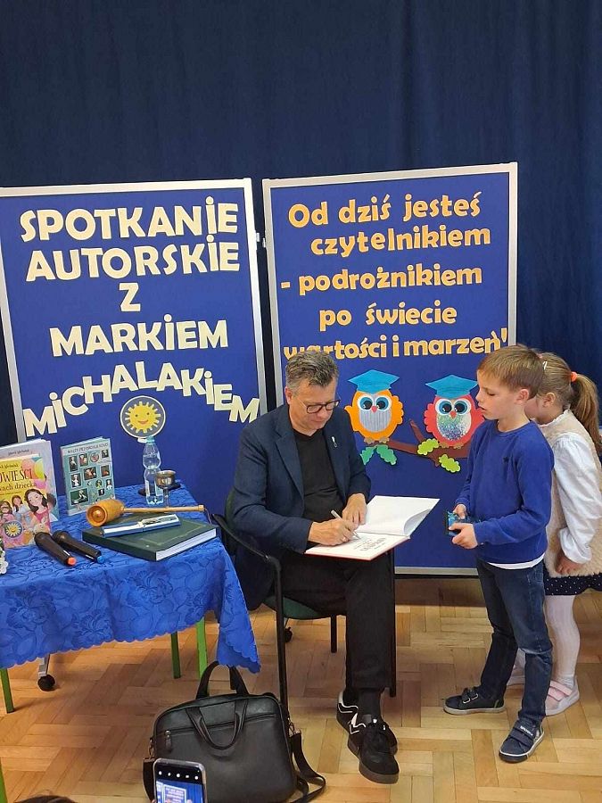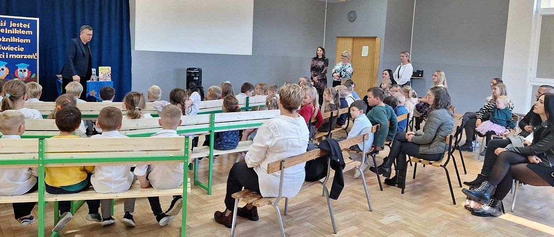 Dziś w naszej szkole odbyło się niezwykłe wydarzenie – spotkanie autorskie z Markiem Michalakiem, byłym Rzecznikiem Praw Dziecka, Kawalerem Orderu Uśmiechu, a przede wszystkim autorem książek dla dzieci! Spotkanie miało wyjątkowy charakter, ponieważ było połączone z uroczystym pasowaniem uczniów klas 1 na czytelników biblioteki szkolnej.