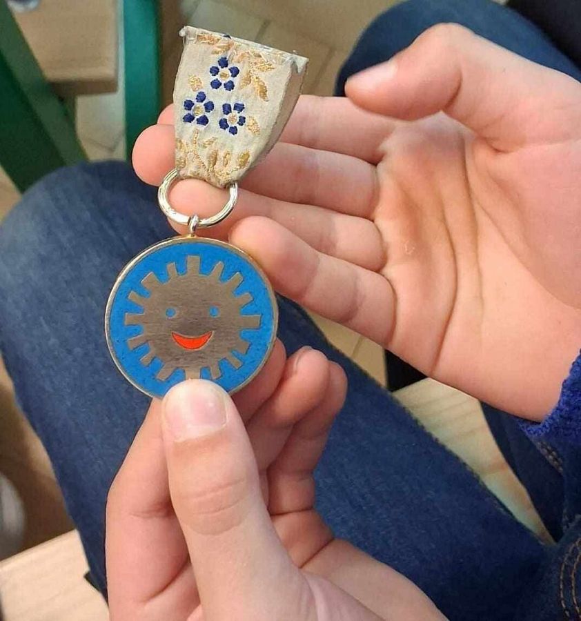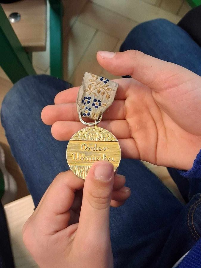 Atmosfera była niezwykle ciepła i pełna ciekawości. Nasi uczniowie mieli okazję zadawać Panu Markowi pytania – i nie ograniczali się wyłącznie do twórczości literackiej! Pytania dotyczyły również jego życia prywatnego, a Pan Marek odpowiadał na nie z radością. Punktem kulminacyjnym spotkania było zaprezentowanie przez Pana Marka Orderu Uśmiechu oraz akcesoriów związanych z tym wyjątkowym wyróżnieniem. Wszyscy obecni mogli dowiedzieć się, czym tak naprawdę jest Order Uśmiechu, jak się go przyznaje oraz co oznacza w życiu jego posiadacza.