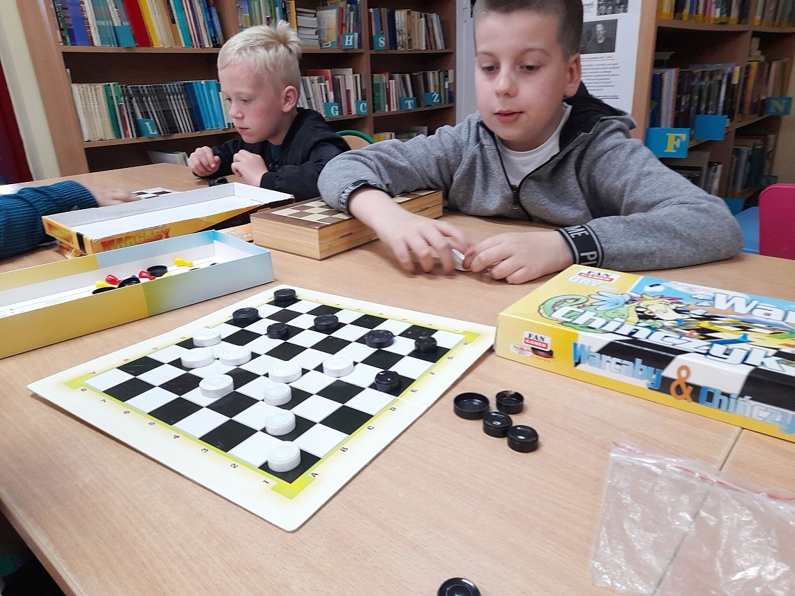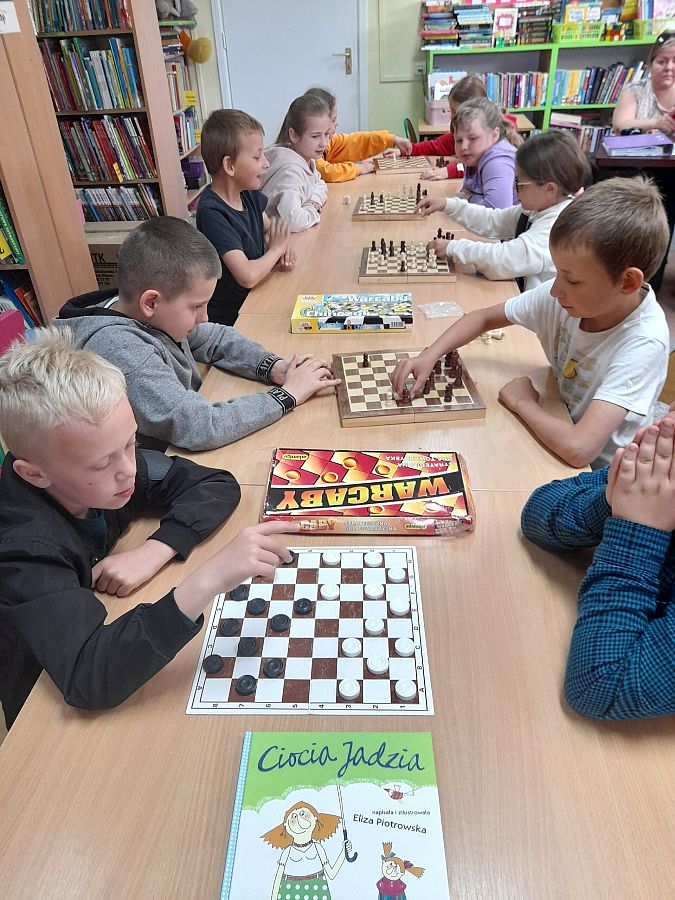 Nasza biblioteka również włączyła się w te obchody. Panie Bibliotekarki zaprosiły do wspólnego czytania uczniów z klasy 3 a. Dzieci poznały Ciocię Jadzię, bohaterkę serii książek Elizy Piotrowskiej, ciocię, o jakiej marzy każde dziecko. Ciocia Jadzia świetnie rozumie je i zawsze potrafi znaleźć dobrą radę. Lubi również, tak jak nasi zaproszeni goście, grać w warcaby i …czasami wygrywać, a czasem przegrywać.