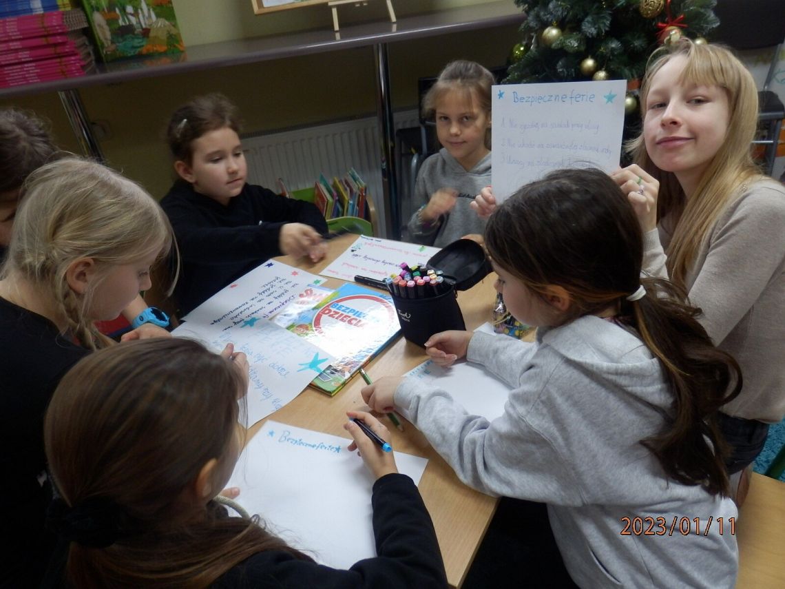 W czasie przerwy dzieci ...się nie nudzą, bo przychodzą do biblioteki, gdzie grają w planszówki i gry karciane, a także czytają i malują. Obecnie prace plastyczne związane z bezpiecznymi feriami!